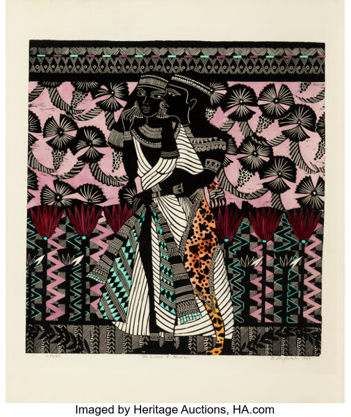 Linocut with hand coloring on wove paper