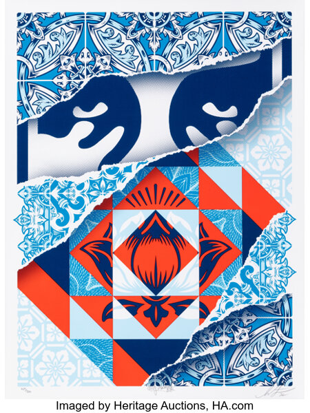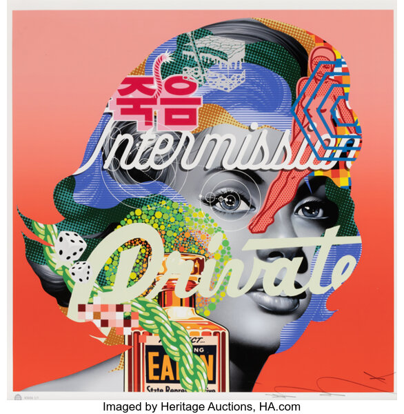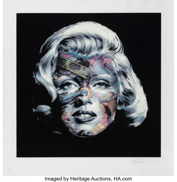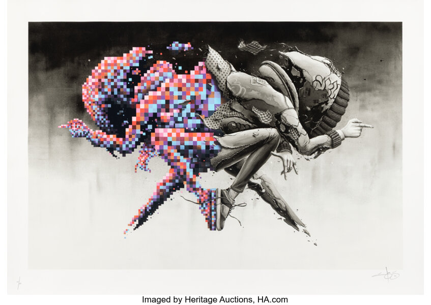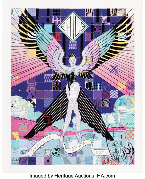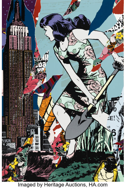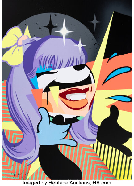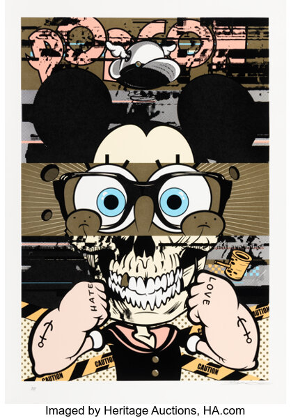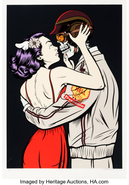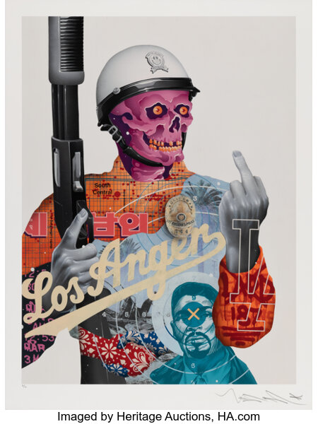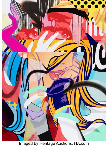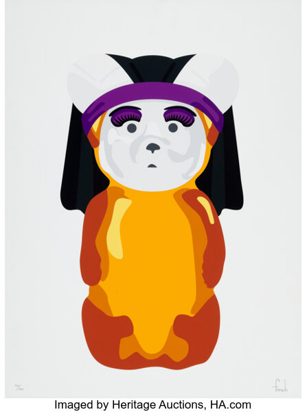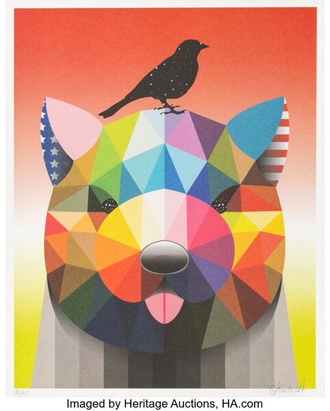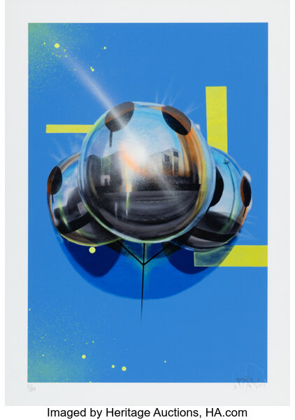 Screenprint in colors with spray paint hand-embellishments on Mohawk paper