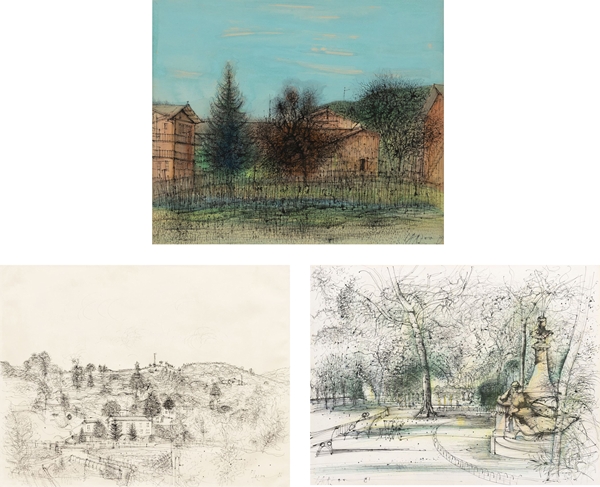 a set of three drawings (watercolour and ink / ink / ink and pastel, all on paper)