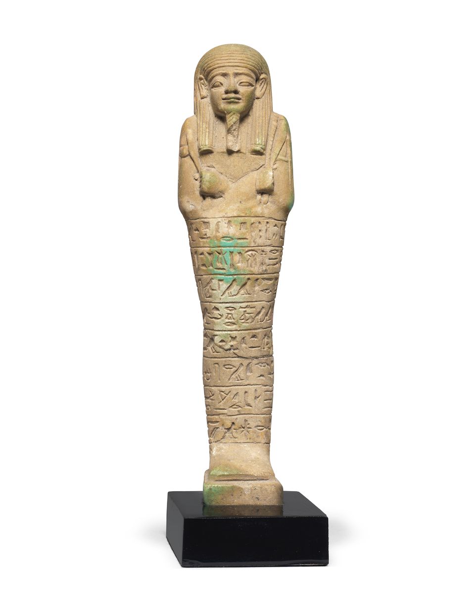 An Egyptian pale green glazed faience shabti for the Overseer of the Treasu...