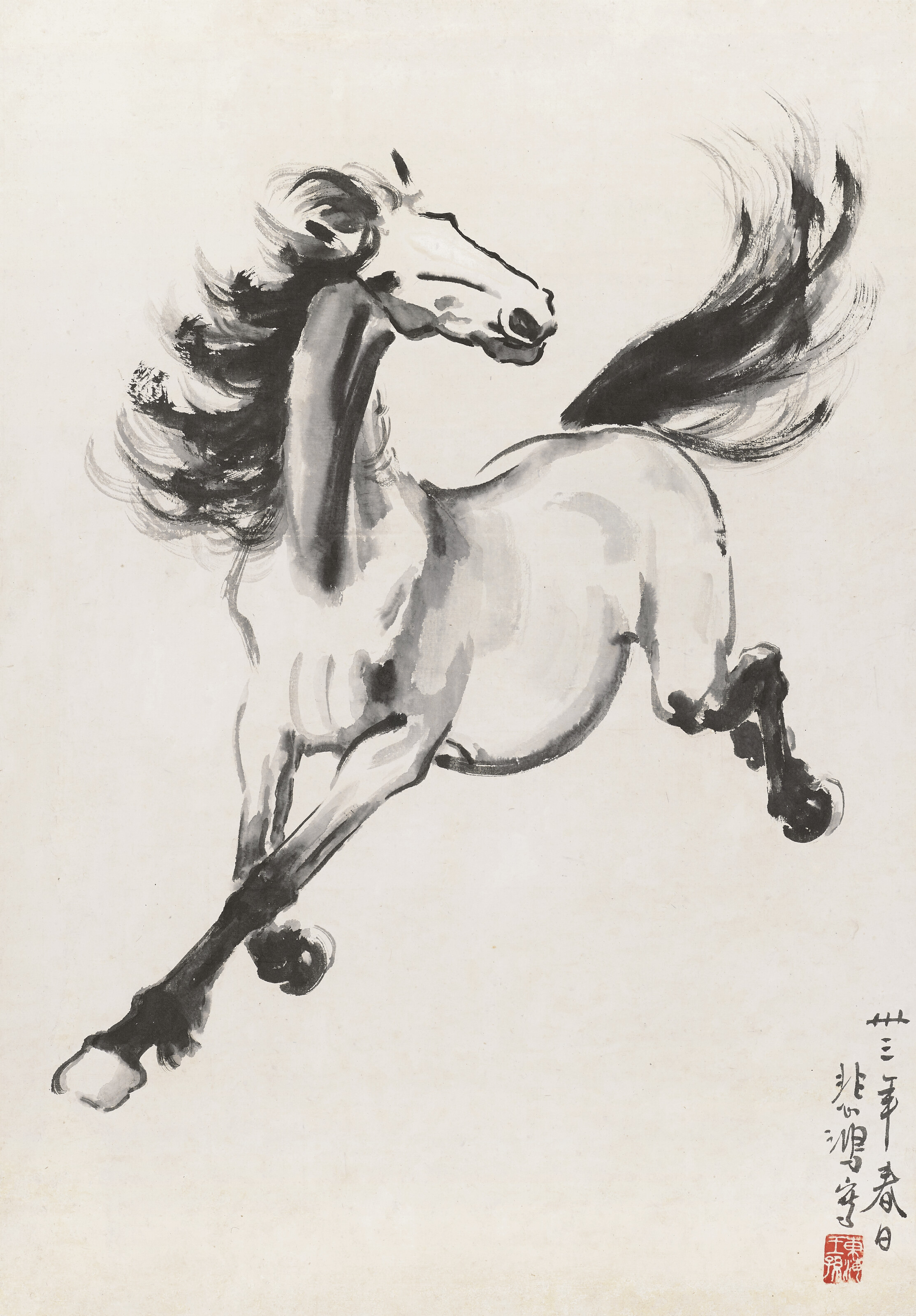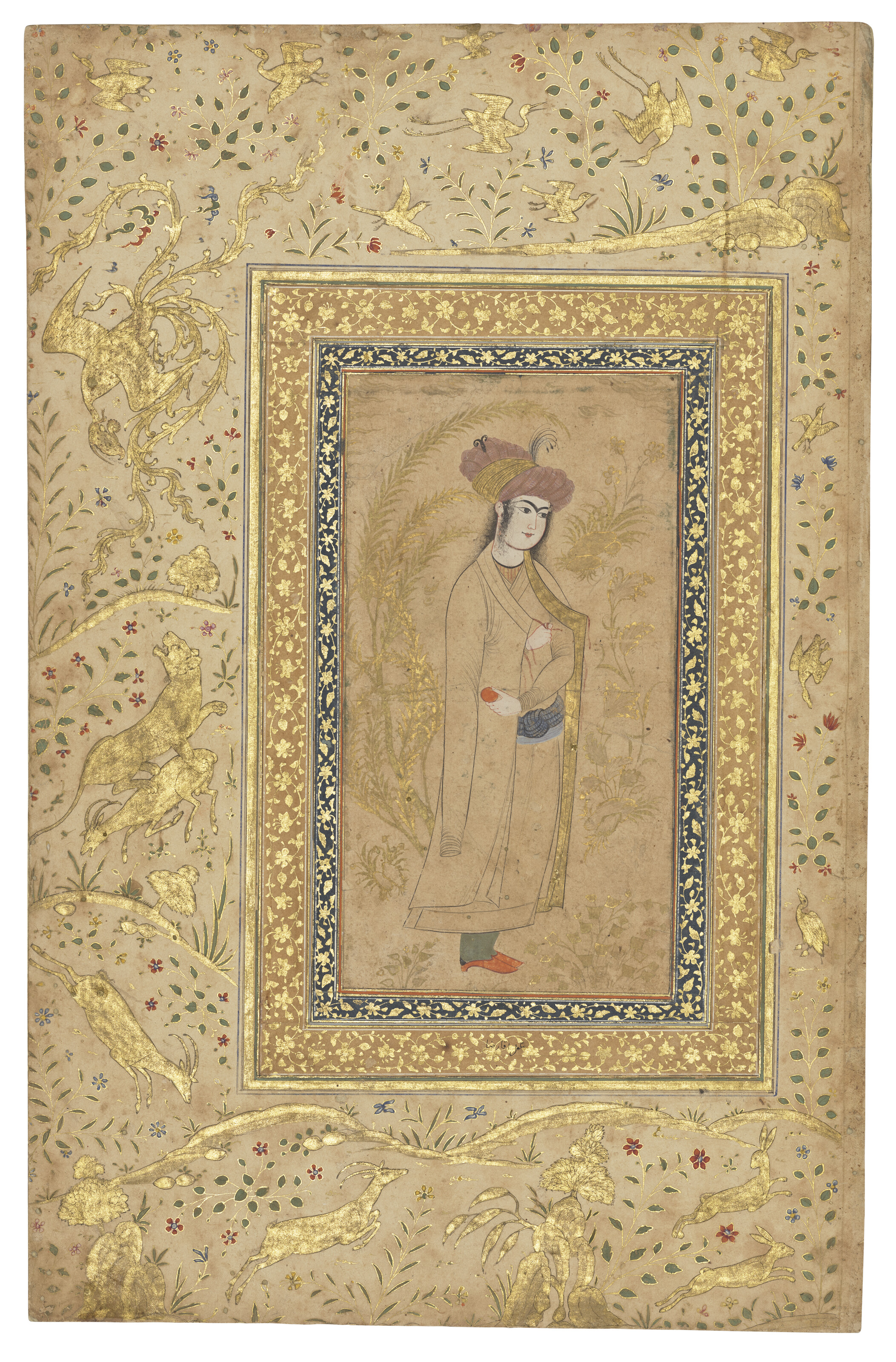 Ink and opaque pigments heightened with gold on paper, set within orange and gold rules, laid down on navy blue and buff borders stencilled with gold, the outer border with apocryphal attribution, laid down on card, the cream margins finely decorated in gold and polychrome with animals and birds in landscapes, verso with 11ll. fine black nasta'liq arranged in two columns reserved against illuminated gold cloudbands, laid down on buff and dusty blue paper borders stencilled with gold, the cream margins finely decorated with small paintings of flowering plants, mounted, framed and glazed