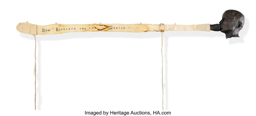 ronze, patina with micro-crystalline wax, oil paint, tea-stained muslin, thread, and epoxy