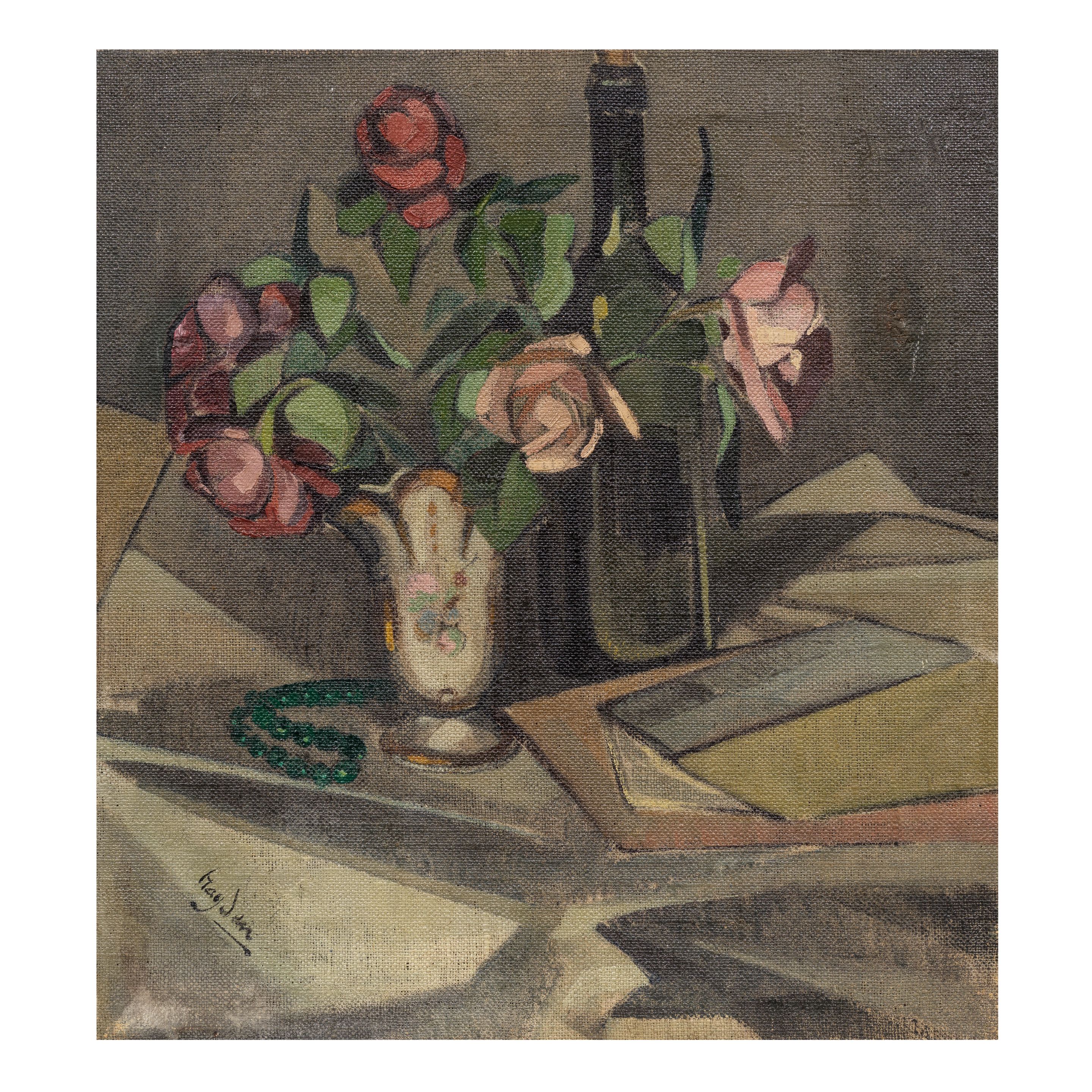 Nature morte (vase de fleurs, roses et collier vert)