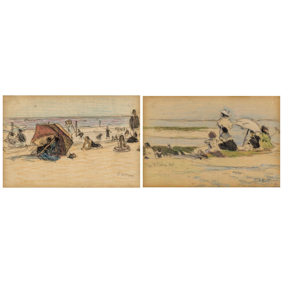 Beach Scenes with Red and White Umbrellas: A Pair of Works