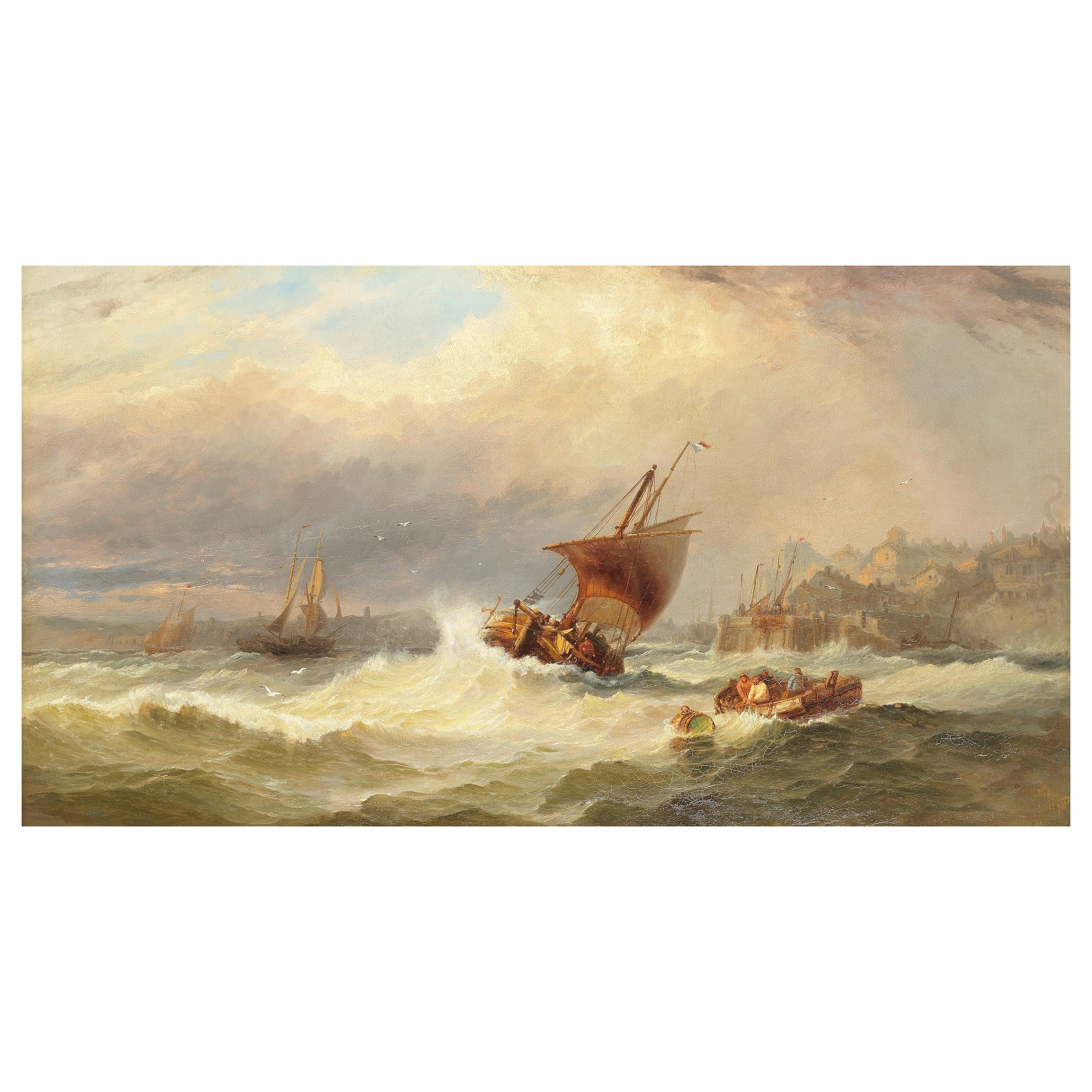 Fishermen battling waves before a harbour