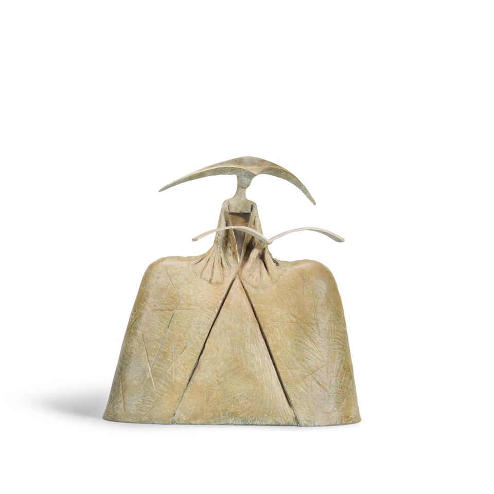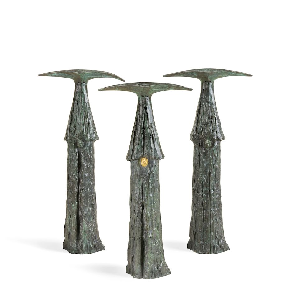 bronze with a white and ferric patina, and polished bronze