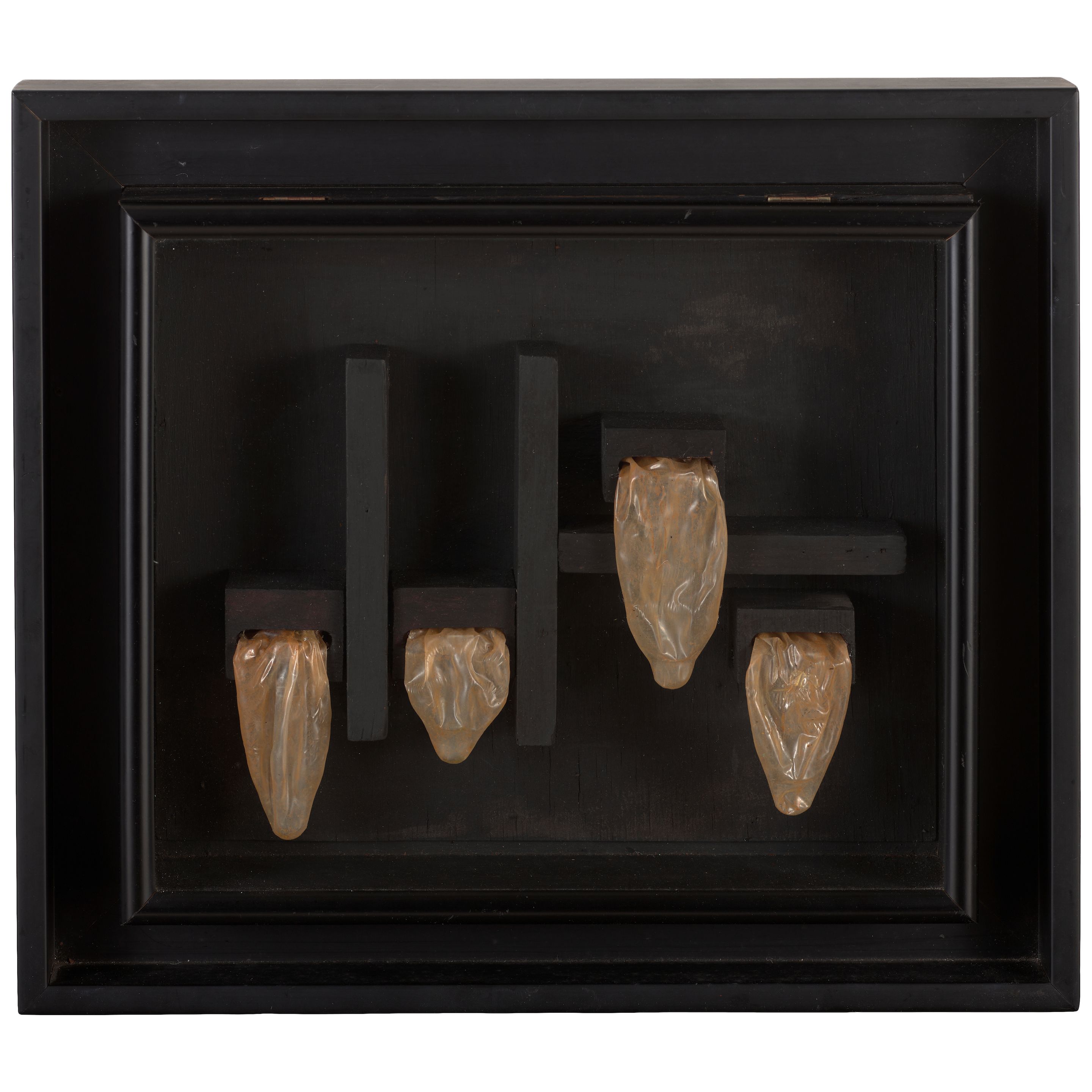 wood, glass and condom collage on wood