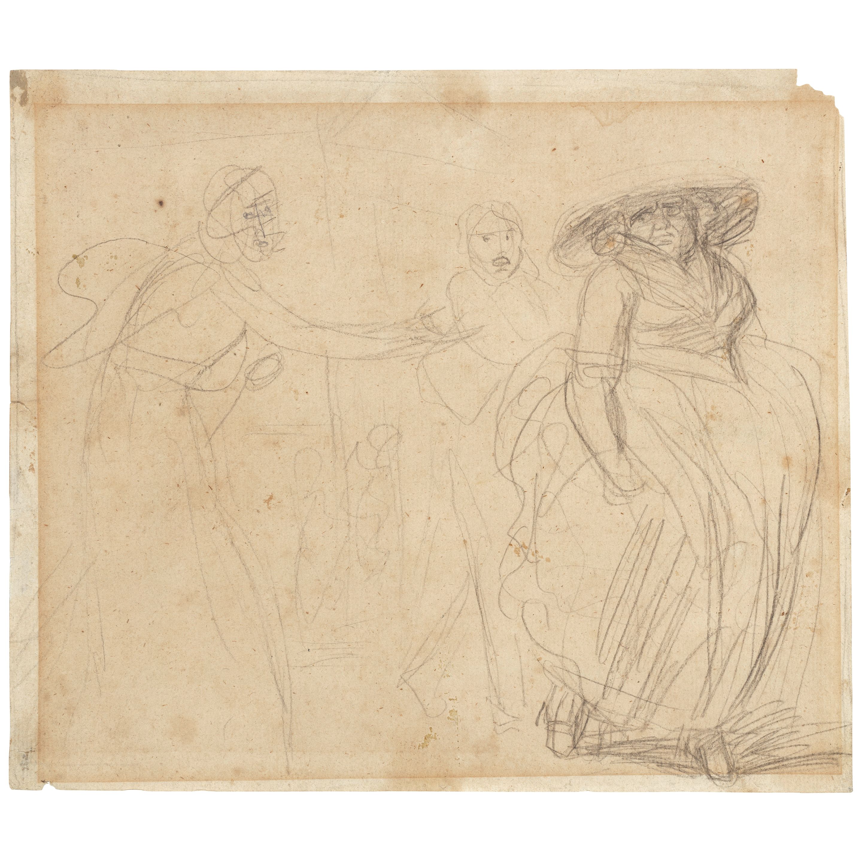 black chalk, pen and gray ink, gray and red wash, on buff prepared paper