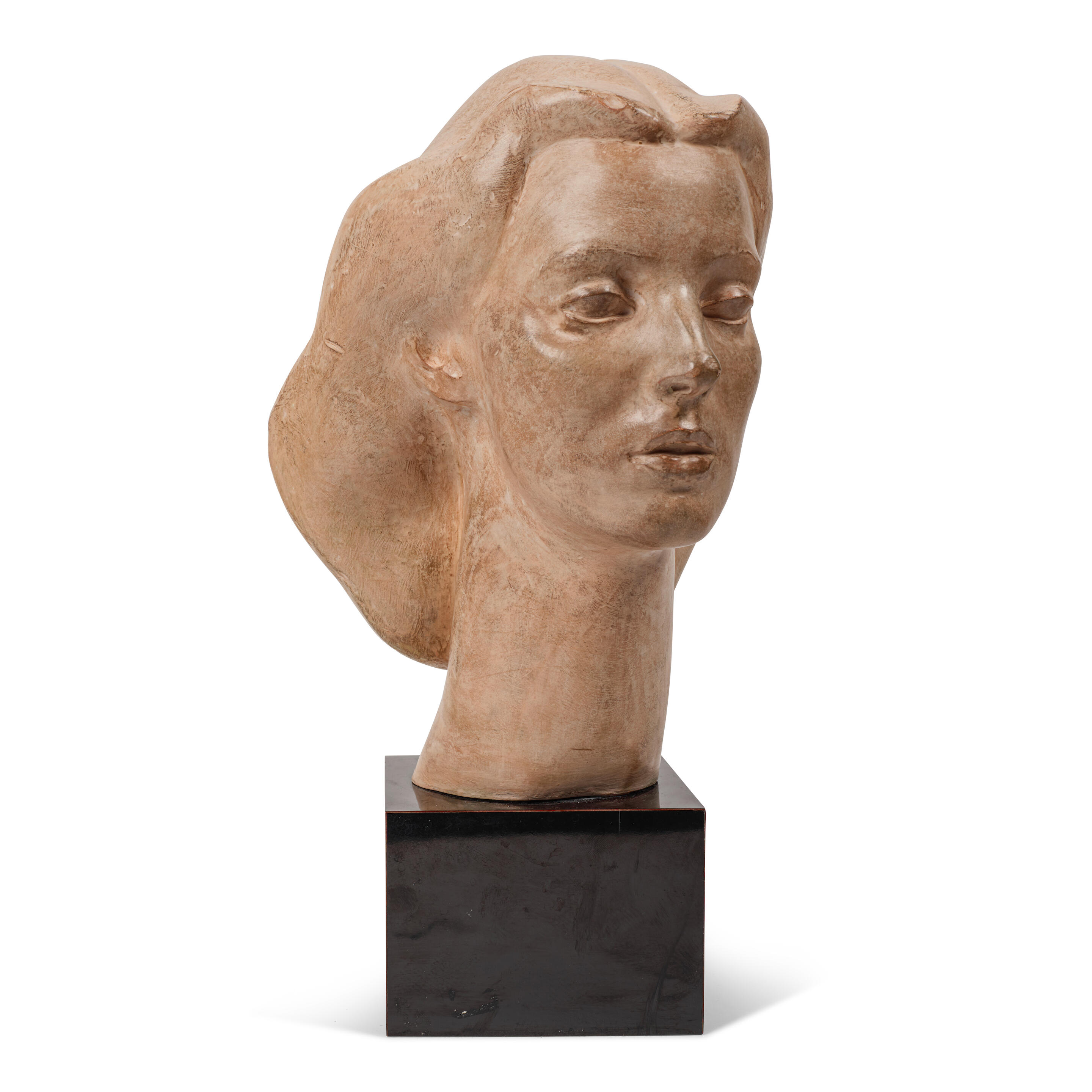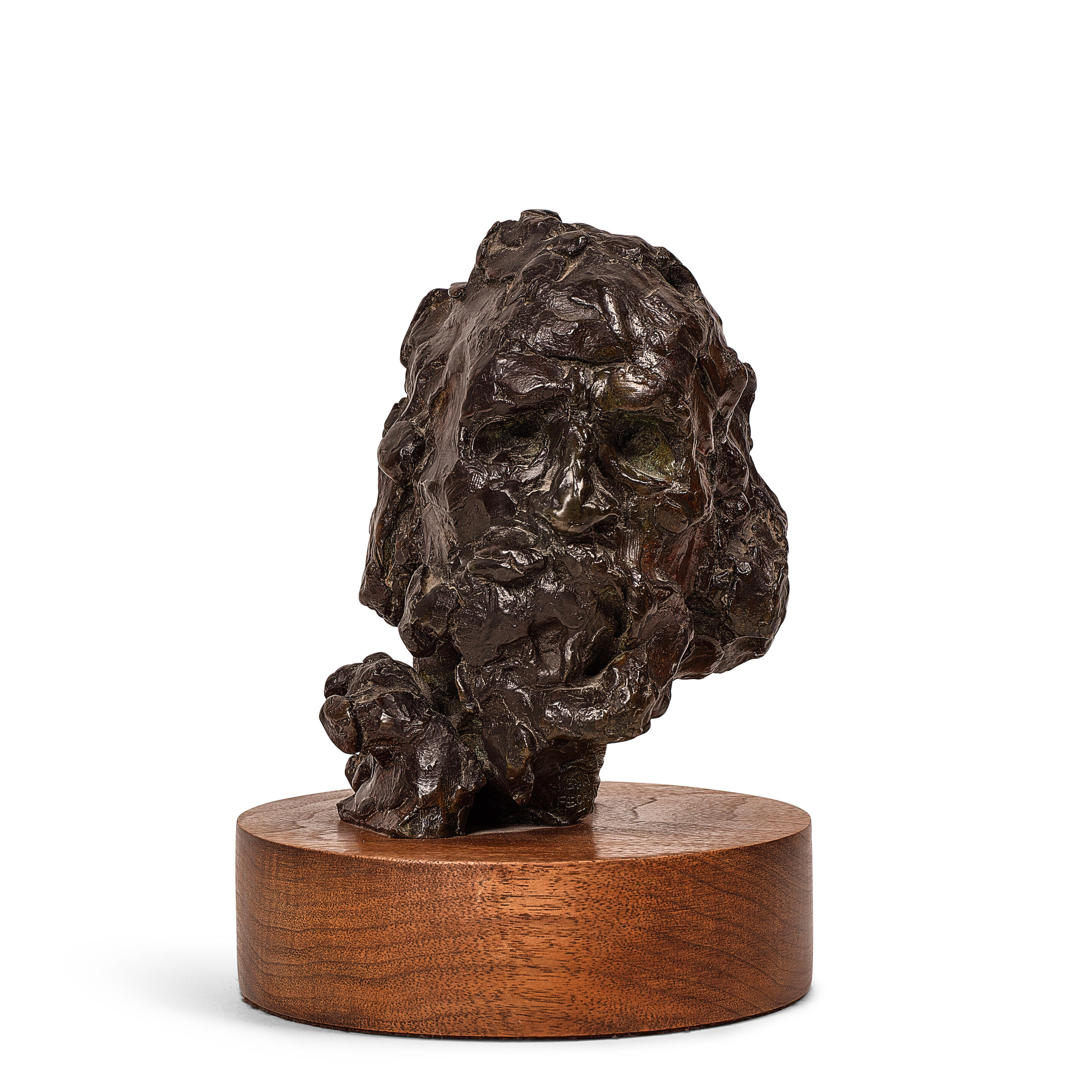 Mounted to a stained wood base, depicting a skull-faced figu...