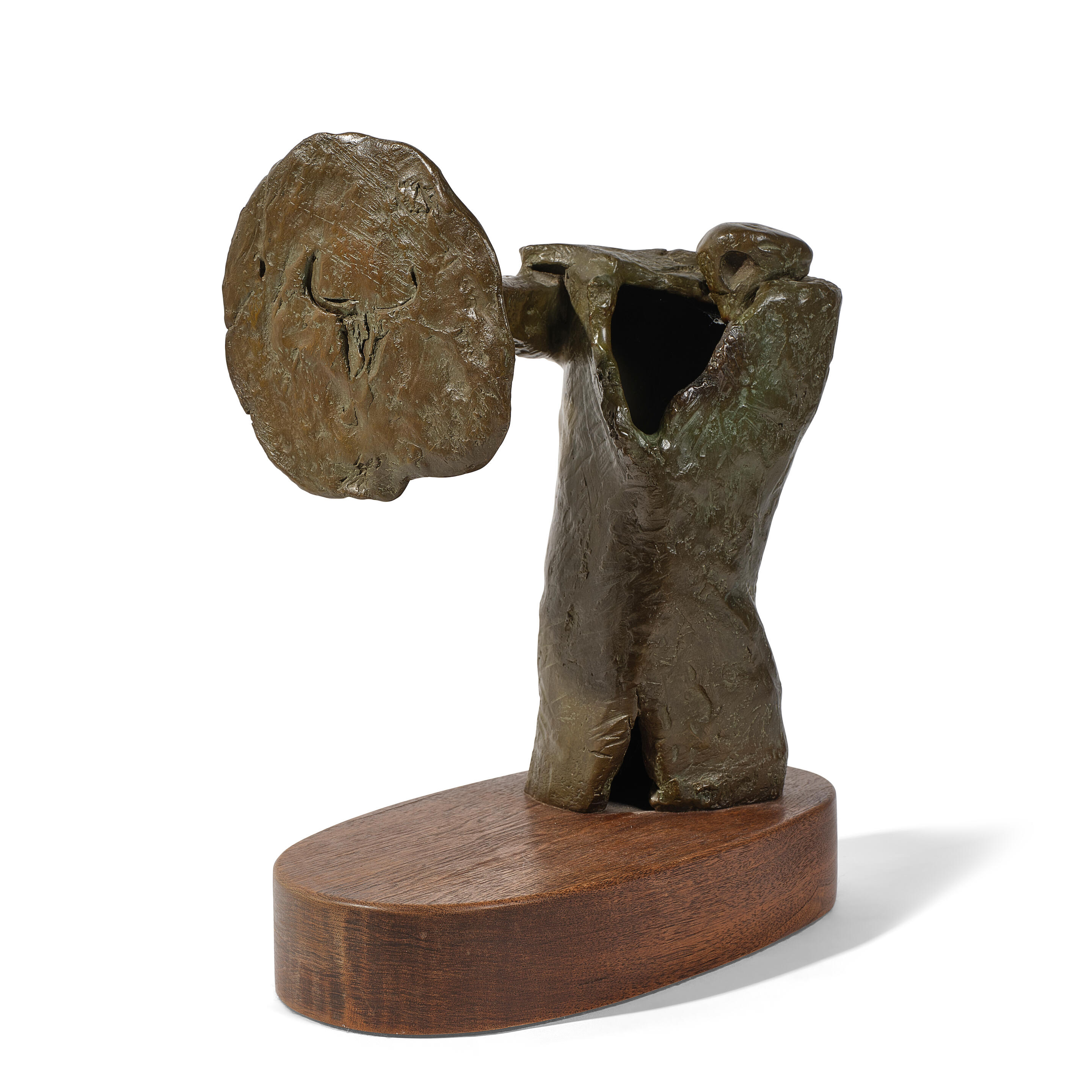 FRITZ SCHOLDER : A PATINATED BRONZE FIGURE HOLDING A SHIELD: THE LAST WARRIOR